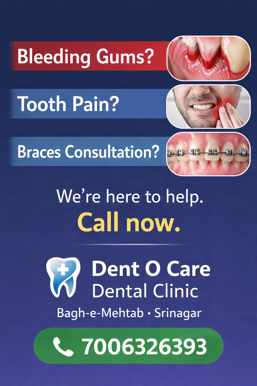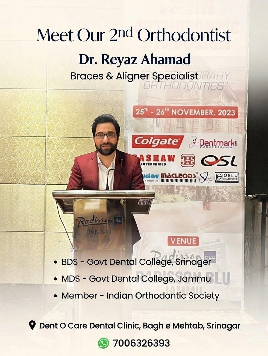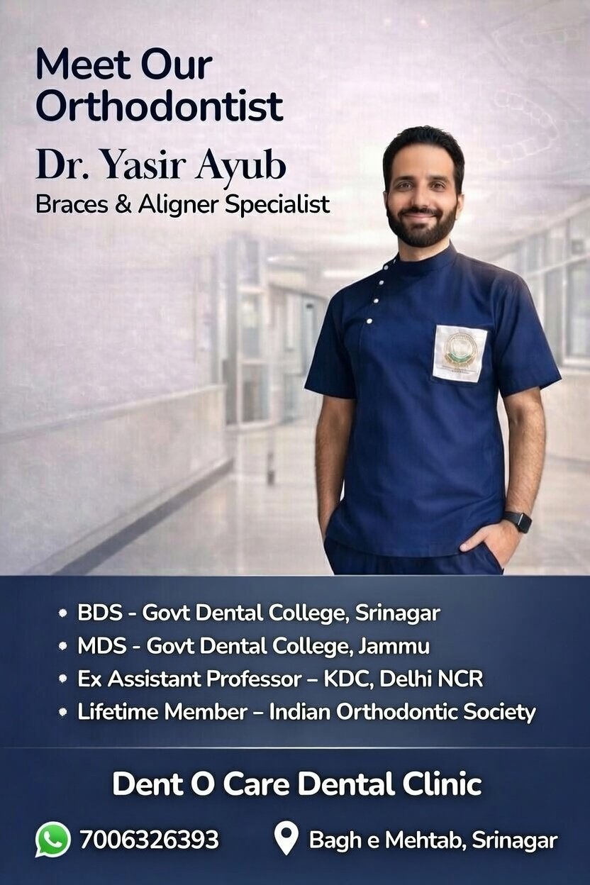 Dent O Care Dental Clinic – Trusted dental clinic in Bagh-e-Mehtab, Srinagar near Iqra International School. We provide advanced, painless dental treatments using latest technology and a compassionate team. Expert in: • Braces (Metal & Ceramic) • Clear Aligners • Root Canal Treatment • Dental Implants • Scaling, Polishing & Teeth Whitening • Full Dentures & Crowns • Pediatric & Cosmetic Dentistry • Same-day Emergency Care Affordable prices with family packages across Srinagar & Kashmir. Clean, modern clinic with personalized care. 📍 Bagh-e-Mehtab, Near Iqra International School 📞 Call or WhatsApp 70063 26393 NOW for Consultation! Transform your smile at the best dental clinic in Srinagar. Book today!